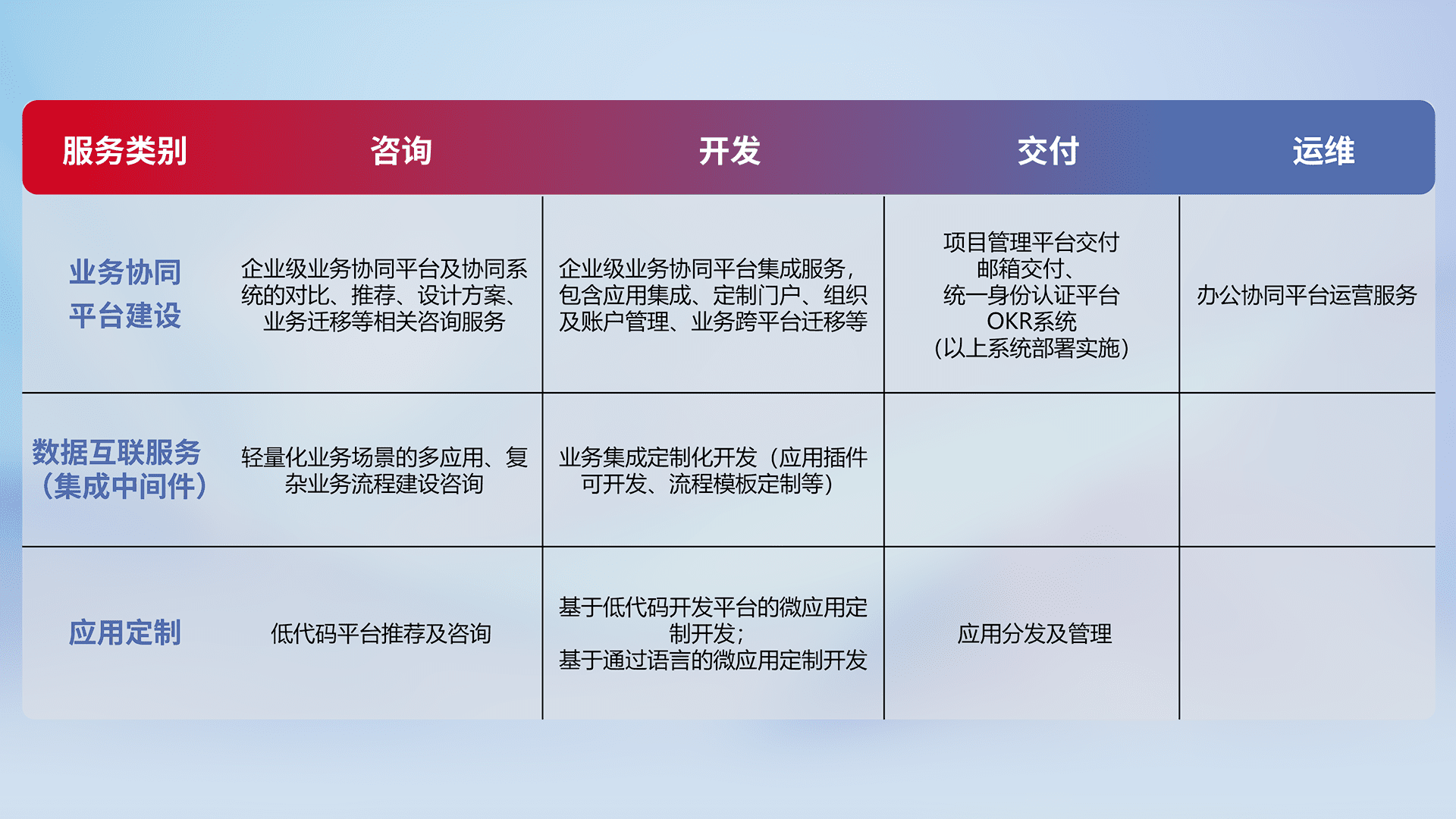 针对钉钉、、、、企微、、、IDaas等平台级产品提供产品的规划、、、方案、、、交付、、、、定制化开发等服务,,,实现如统一协同办公、、、、智能客户服务、、混合会议管理、、智能数据查询、、、等业务场景,,,实现数字化转型。。。