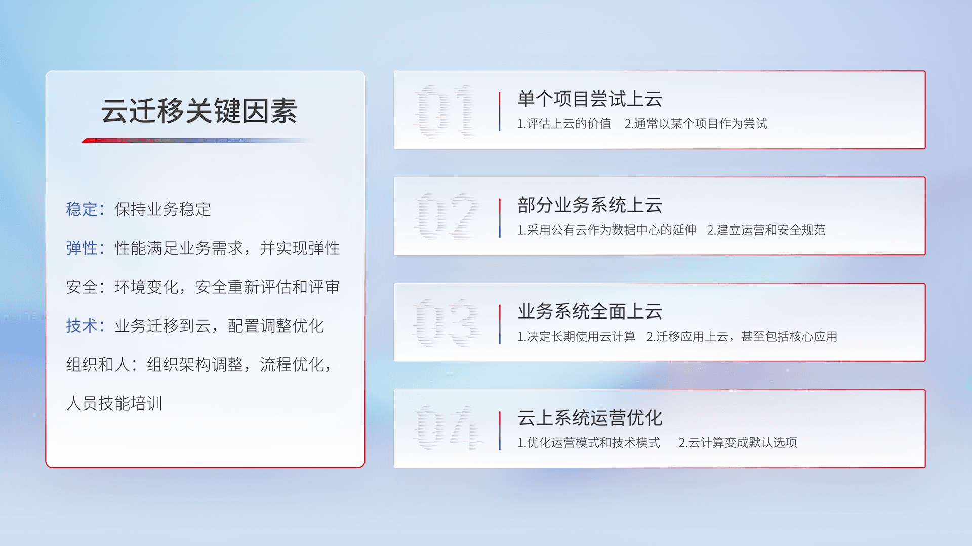 结合实际业务,,,,从规划设计、、云平台选型、、、、云原生改造、、数据迁移、、、、集成交付,,迁移全过程为客户识别最佳上云路径,,,,做好风险识别管理,,设计网络架构、、身份权限、、、、安全审计合规、、操作审计、、、、日志审计、、、监控告警策略、、、多站点容灾设计等,,,对云上基础设施进行整体规划,,,提升IT治理水平,,,以满足弹性、、高可用、、、高性能的需求。。。