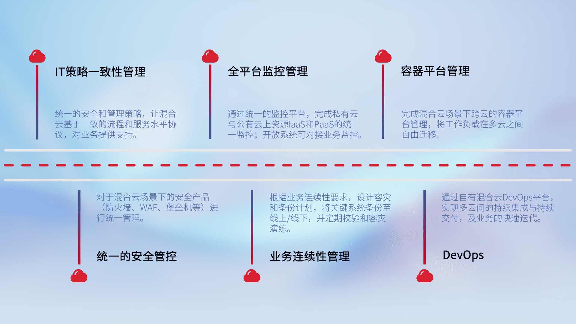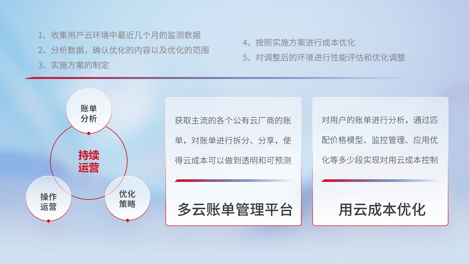 通过多云纳管,,以统一的资源数据模型把客户的云资源进行抽象和封装,,,,进而实现对多云资源的统一操作,,,保障云资源管理的可靠性、、、、稳定性与可用性。。量身定制化运维内容,,,,配置、、、、开发运维、、、、补丁管理、、、、备份、、、、监控、、、认证和访问管理、、审计和日常巡检等,,,保障在用云过程中的可靠度,,,,稳定度以及高可用率。。。。